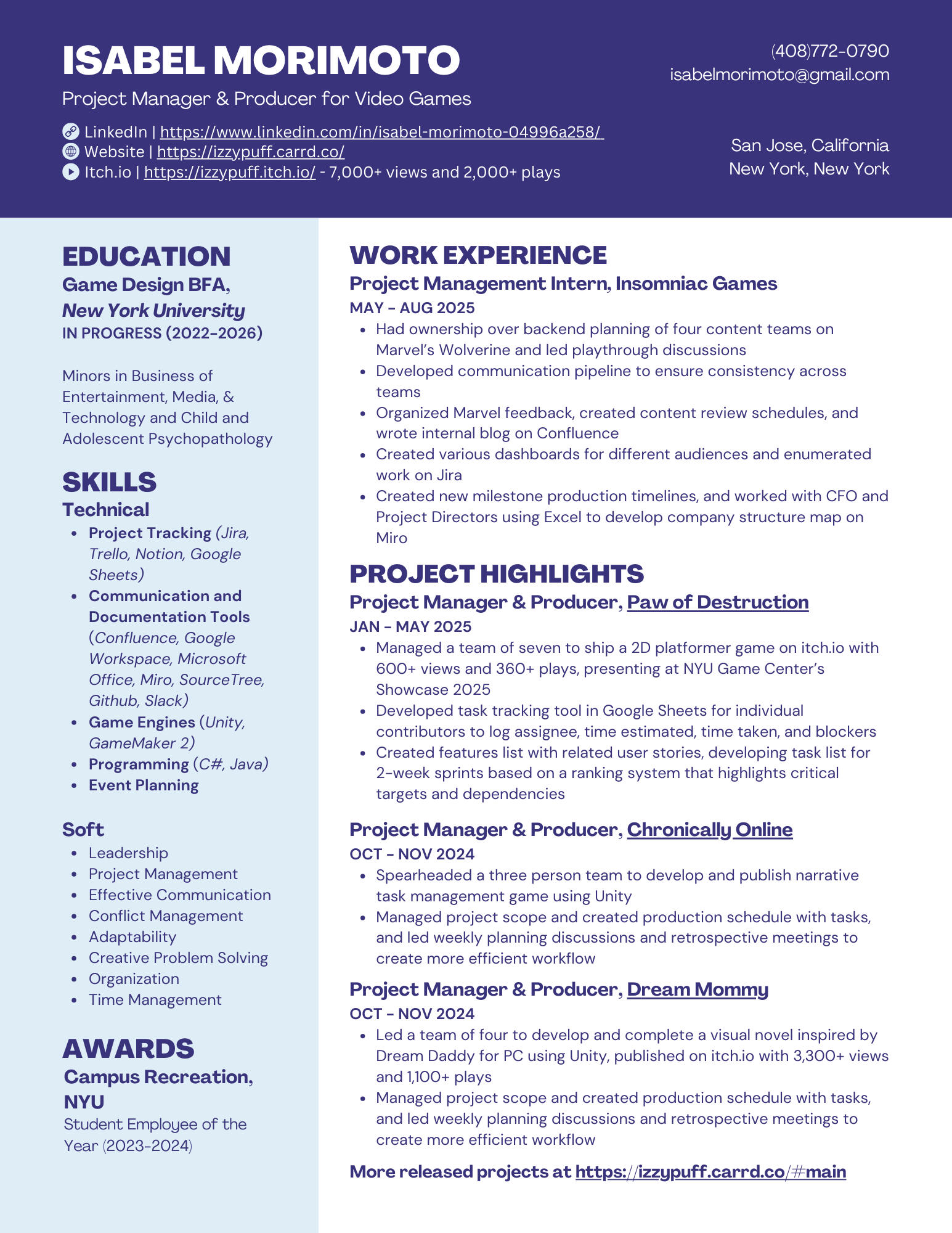 Artist, UI/UX Designer, Producer/Project Manager // Team of 72D Action Cat-former˗ˏˋ ꒰ ♡ ꒱ ˎˊ˗Play as a chaotic cat in this 2D platformer with one mission: total destruction. Pounce, paw, and knock items over as you explore your owner’s seemingly normal house—just watch out for household appliances turned evil.Showcased at NYU's Game Center Showcase