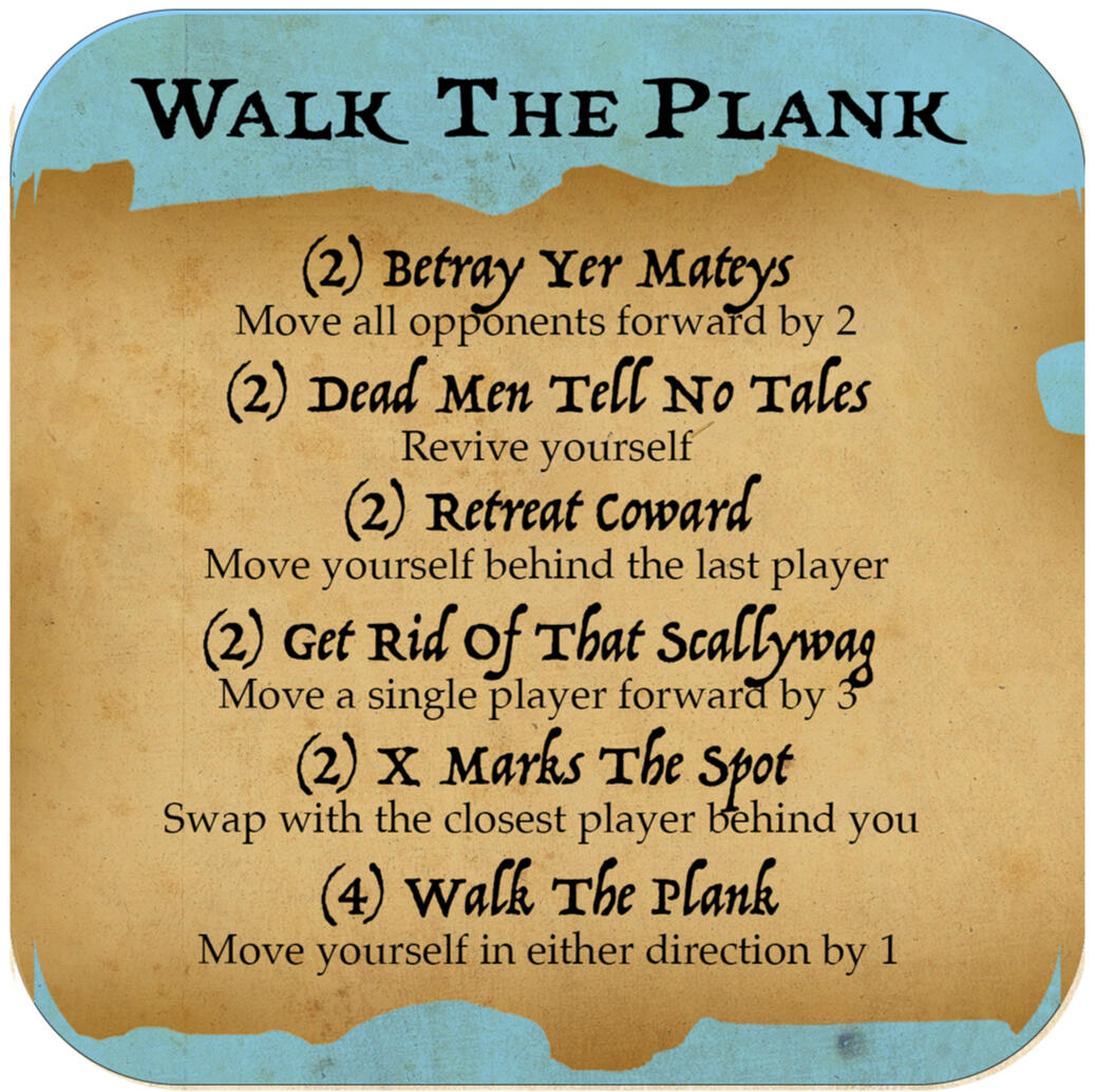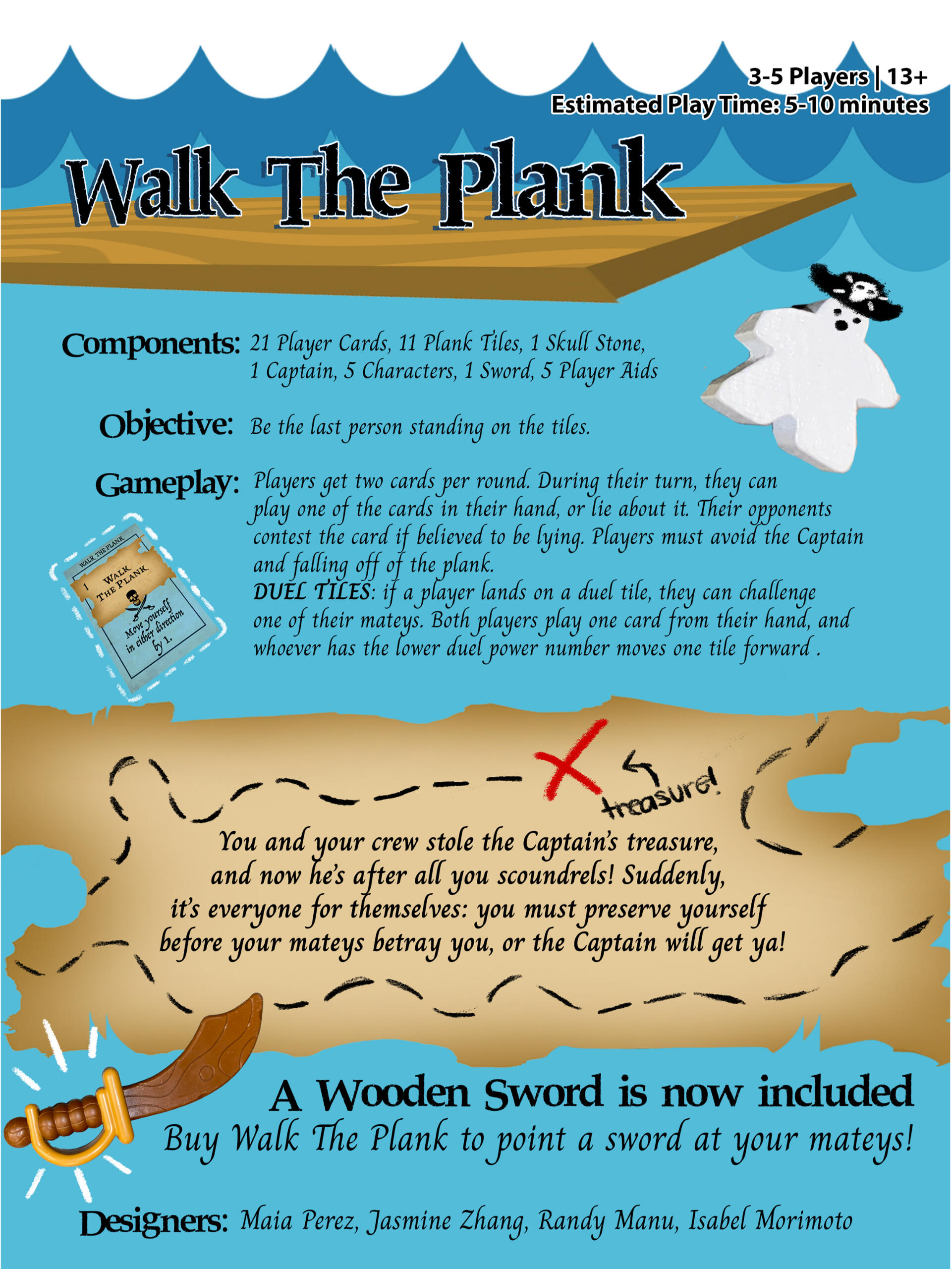 Game Designer, UI/UX Designer, Producer/Project Manager // Team of 5Tabletop Party˗ˏˋ ꒰ ♡ ꒱ ˎˊ˗You and your crew stole the Captain's treasure, and now he's after all you scoundrels! Suddenly, it's everyone for themselves: you must preserve yourself before your mateys betray you, or the Captain will get ya!Walk the Plank is a face-paced (5-10 minutes) party game for 3-5 players. Use your cards to balance on the plank and make others fall off.