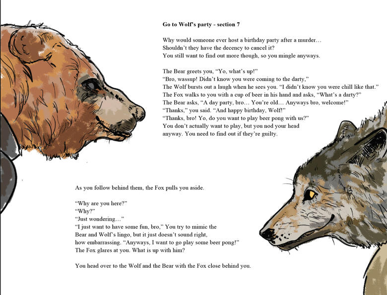 Game Designer, Narrative Designer, Producer // Team of 4Interactive Storybook˗ˏˋ ꒰ ♡ ꒱ ˎˊ˗Death of the Hen is a one-player choose-your-own-adventure book where you can collect evidence cards as the story unfolds.A hen was murdered and a bride is going to be killed next. As a private investigator from another world, the player must solve the mystery by making different choices. Will they figure out who killed the hen and prevent the next killing?